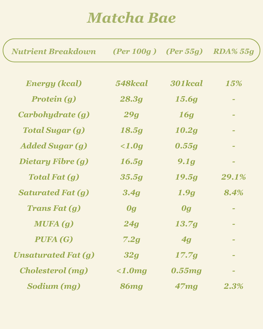 Matcha Bae is a refined fusion of clean energy and bold flavor. It begins with smooth almond butter and chopped pistachios for creamy richness and crunch. Sorghum puffs and puffed quinoa offer a delicate texture, while pea protein brings plant-powered strength. A hint of coconut sugar balances the grassy brightness of matcha for a clean, uplifting taste.