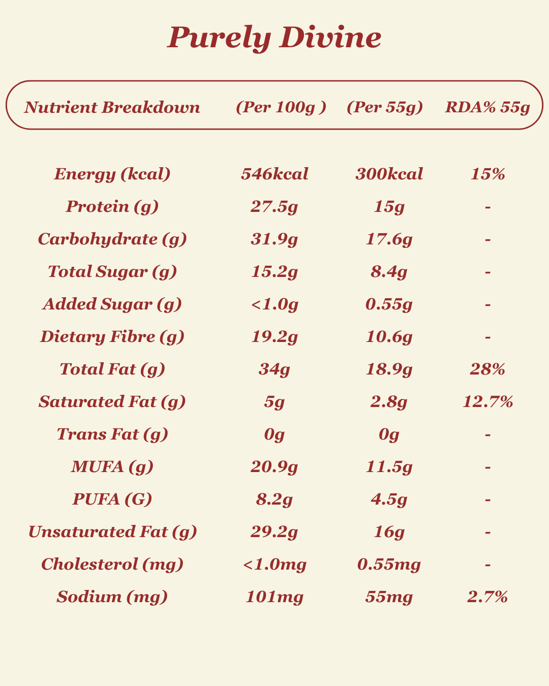 Purely Divine is a soft, nutty blend of nutrient-dense ingredients designed to fuel your day mindfully and deliciously. Almond butter forms the rich, velvety base, while pea protein adds strength and satiety. Ragi (finger millet) and quinoa puffs offer a satisfying crunch and slow-release carbs, while a hint of coconut sugar keeps it gently sweet. Cocoa butter brings a smooth finish, and roasted peanuts add boldness and bite.